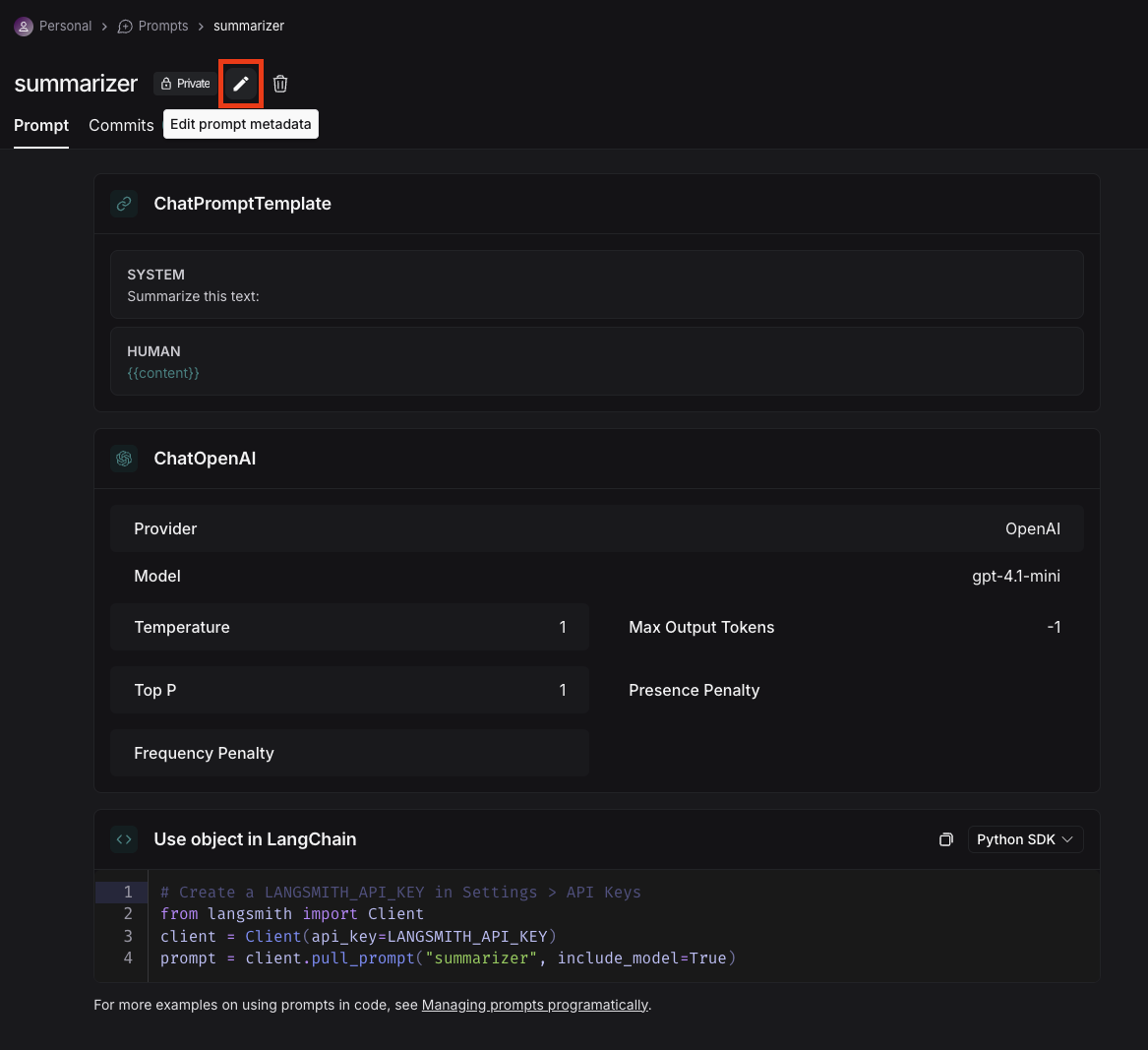 To add metadata to your prompt, click the prompt and then click the “Edit” pencil icon next to the name. This brings you to where you can add additional information about the prompt, including a description, a README, and use cases. For public prompts this information will be visible to anyone who views your prompt in the LangChain Hub.