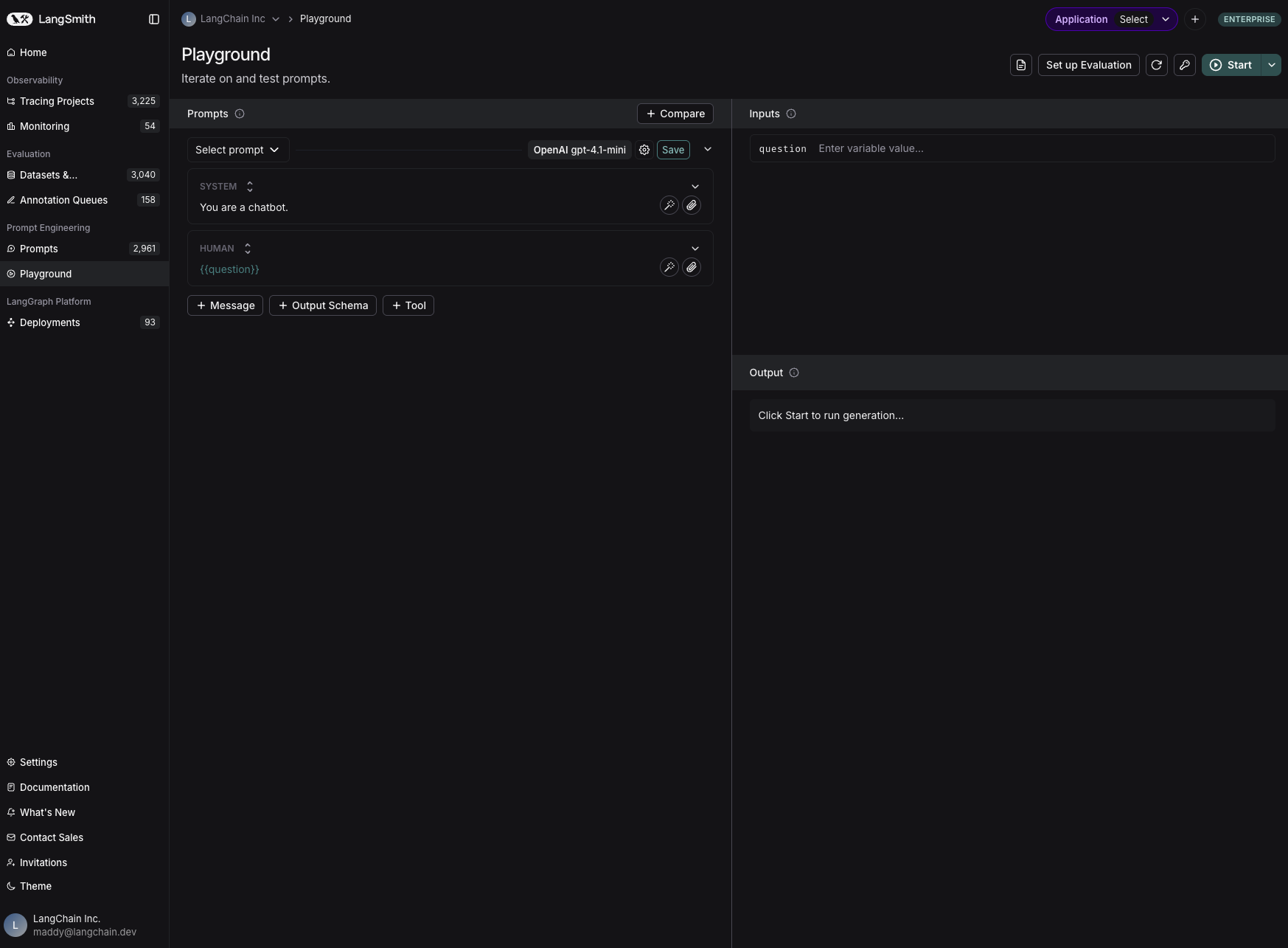 On the left is an editable view of the prompt. The prompt is made up of messages, each of which has a “role” - including system, human, and ai.