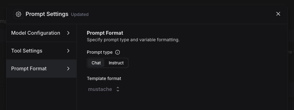 The default template format is f-string, but you can change the prompt template format to mustache by clicking on the settings icon next to the model -> prompt format -> template format. Learn more about template formats here.